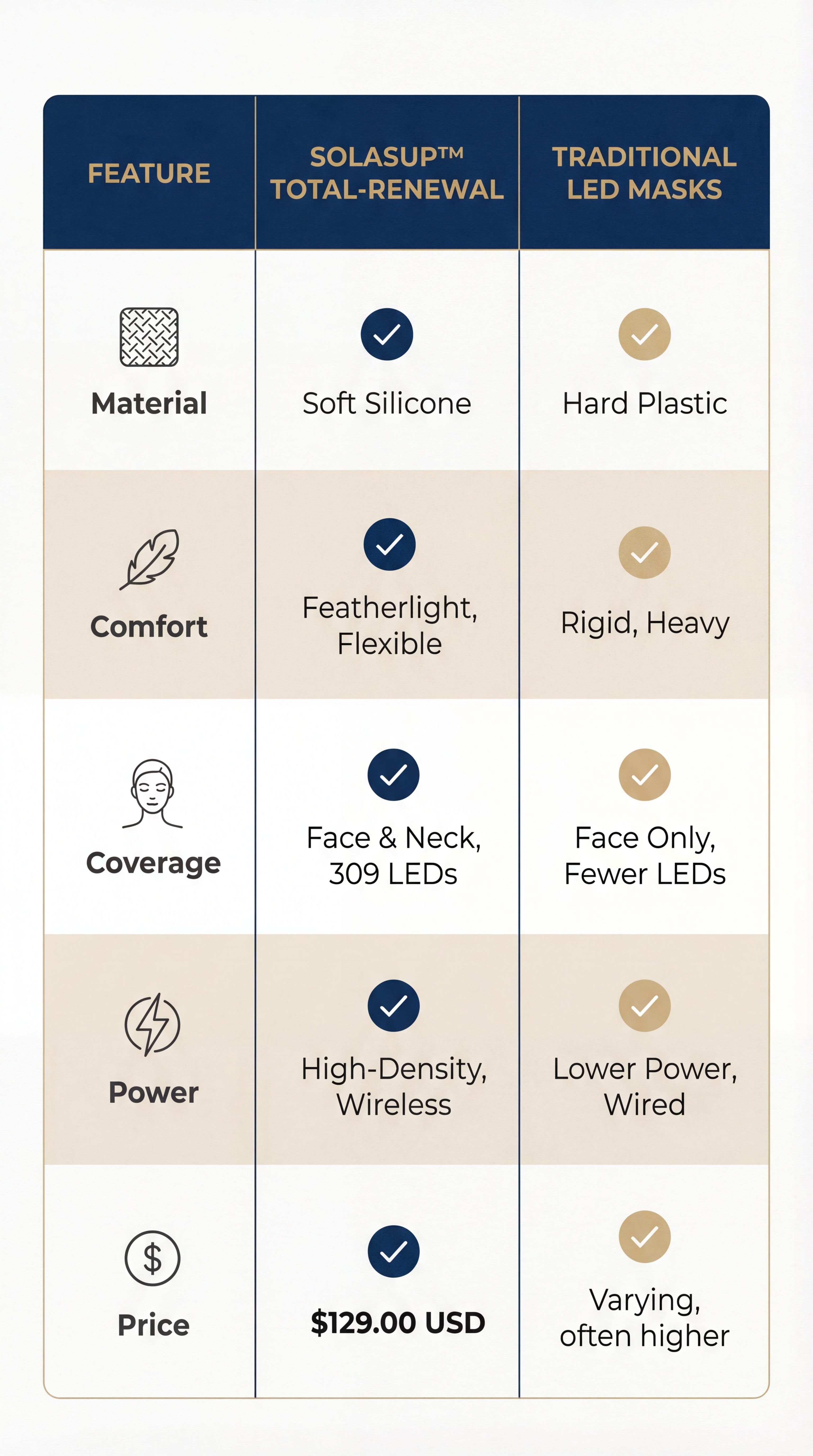 Yes. "Irradiance" (light intensity) is key to results. Many cheaper masks use only 100-150 LEDs, creating "dead zones" on your face. The Solasup™ Total-Renewal system features309 Professional-Grade LEDs(210 on the face, 99 on the neck). This high-density array ensures that clinical-grade photon energy hits every inch of your skin for faster, more uniform results.